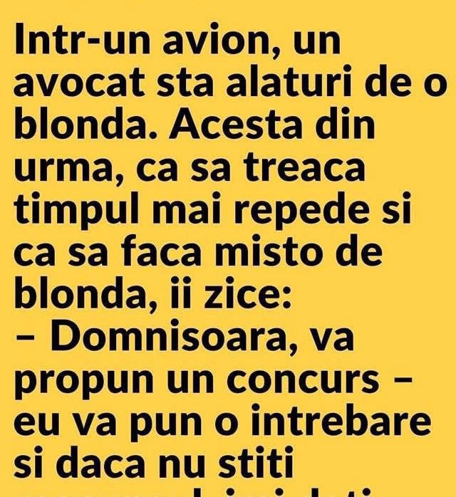 Intr-un avion, un avocat sta alaturi de o blonda. Acesta din urma, ca sa treaca timpul mai repede si ca sa faca misto de blonda, ii zice:– Domnisoara, va propun un concurs – eu va pun o intrebare si daca nu stiti raspunsul, imi dati 5 euro. Dupa aceea, imi puneti o intrebare si daca … Read more