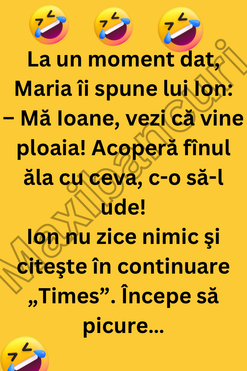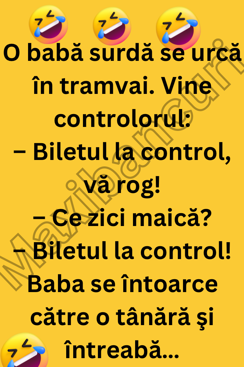 O babă surdă se urcă în tramvai. Vine controlorul:– Biletul la control, vă rog!– Ce zici maică?– Biletul la control! Baba se întoarce către o tânără şi întreabă:– Ce zice, făi, maică?– Zice: Biletul la control. Pentru că dânsul e controlor.Baba se întoarce supărată către controlor şi zice:– Şi eu sunt contra lor, maică, dar … Read more