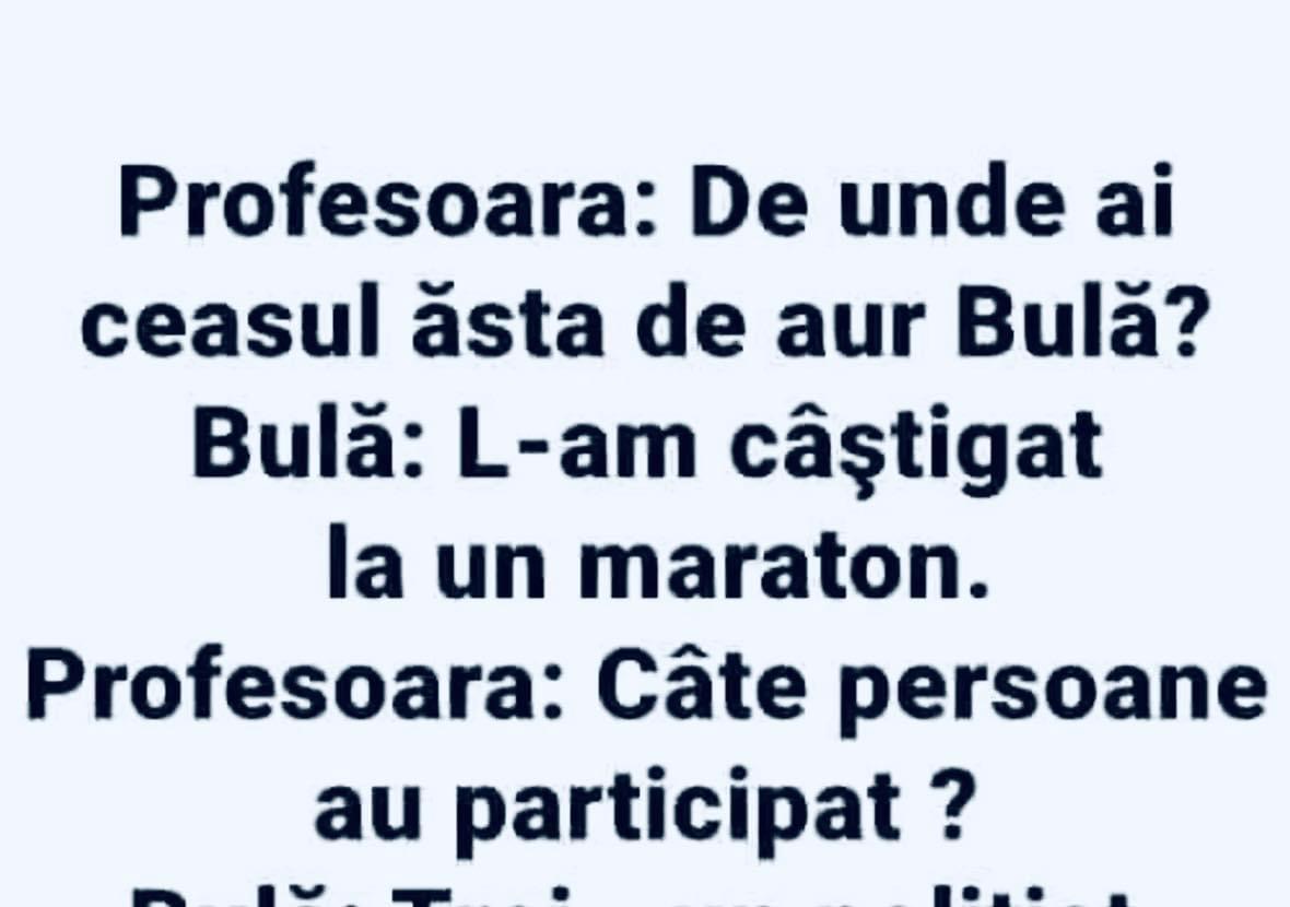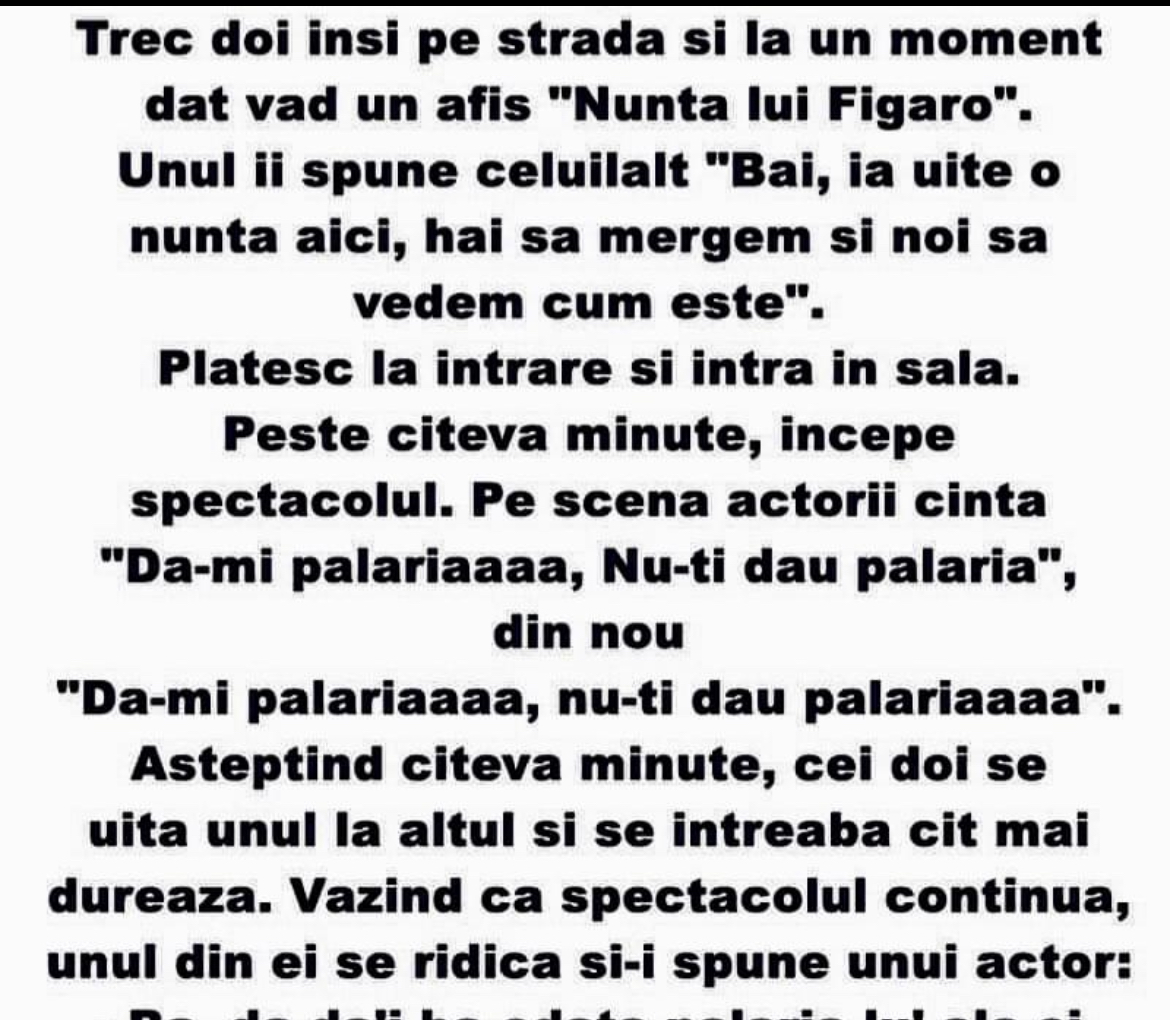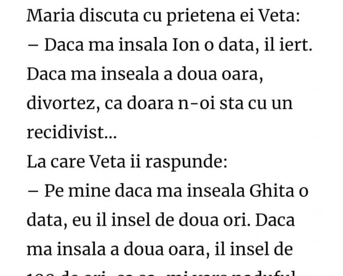 Trece pe strada un cortegiu funerar foarte ciudat: dupa dric urma un tip, un caine fioros si, la mare distanta vreo cincizeci de oameni.Un tip se apropie si intreaba:-Cine a murit ? -Soacra-mea, raspunde tipul, a muscat-o cainele asta.-Nu-mi imprumuti si mie cainele?-Ba da, dar aseaza-te la coada… Soţul şi soţia călătoresc cu trenul.La un … Read more