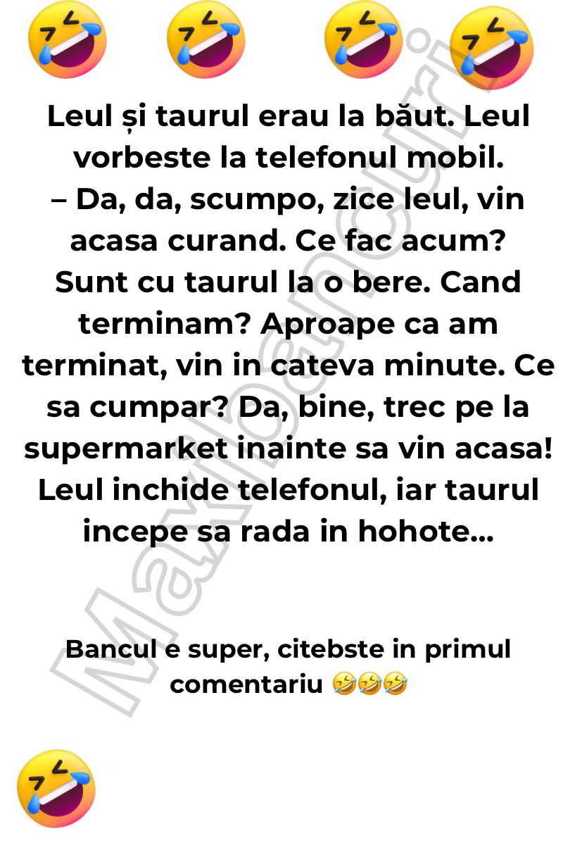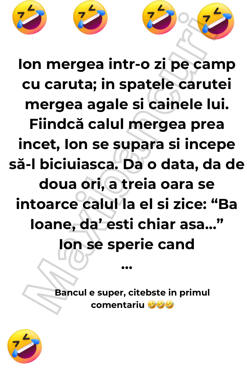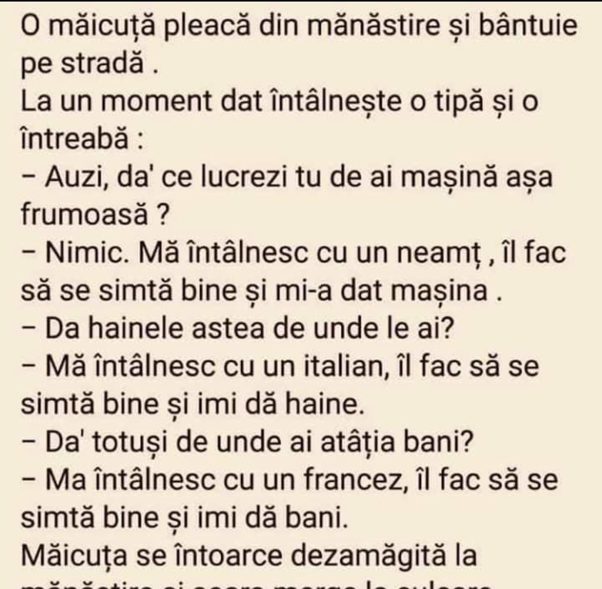 Trece pe strada un cortegiu funerar foarte ciudat: dupa dric urma un tip, un caine fioros si, la mare distanta vreo cincizeci de oameni.Un tip se apropie si intreaba:-Cine a murit ? -Soacra-mea, raspunde tipul, a muscat-o cainele asta.-Nu-mi imprumuti si mie cainele?-Ba da, dar aseaza-te la coada… Soţul şi soţia călătoresc cu trenul.La un … Read more