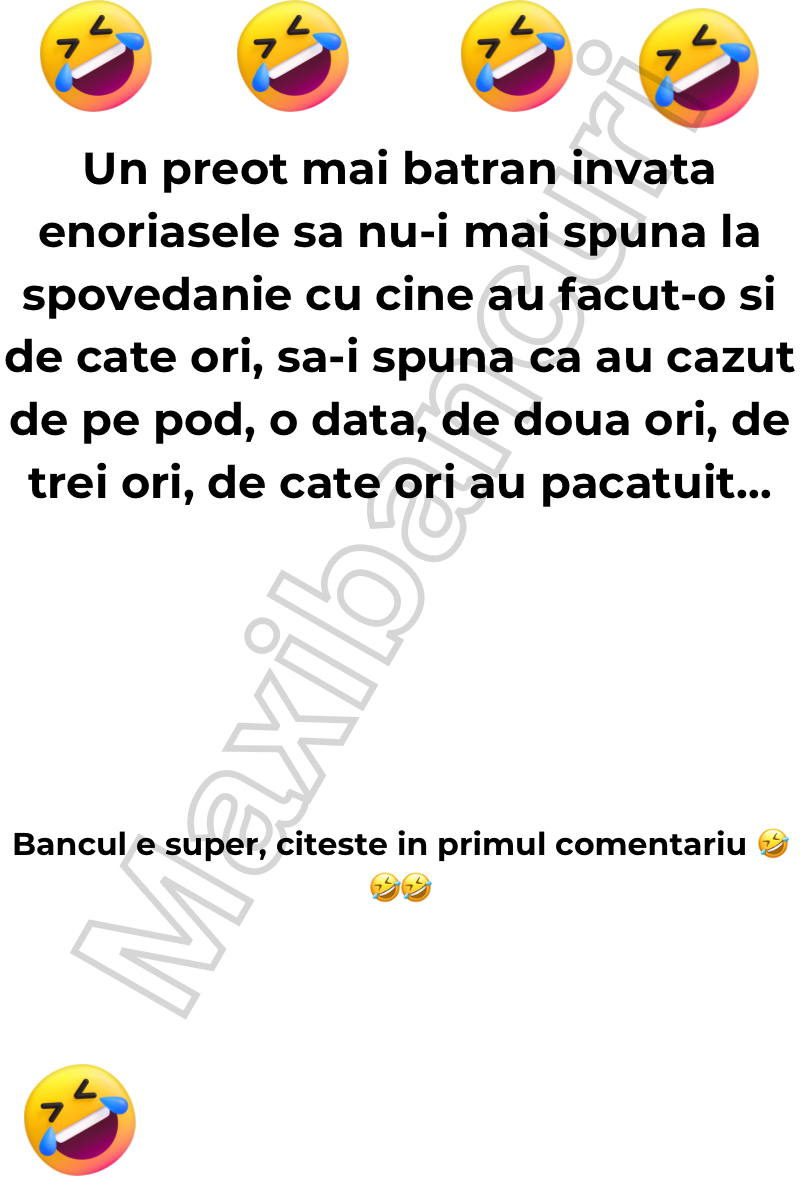 Un preot mai batran invata enoriasele sa nu-i mai spuna la spovedanie cu cine au facut-o si de cate ori, sa-i spuna ca au cazut de pe pod, o data, de doua ori, de trei ori, de cate ori au pacatuit.Trece timpul, preotul cel batran moare iar in locul lui vine unul tanar care de … Read more