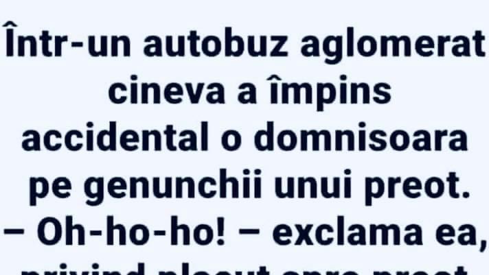 Intr-un autobuz aglomerat cineva a impins accidental o domnisoara pe genunchii unui preot! Oh OH OH exclama ea privind placut spre preot Nici un oho oho..