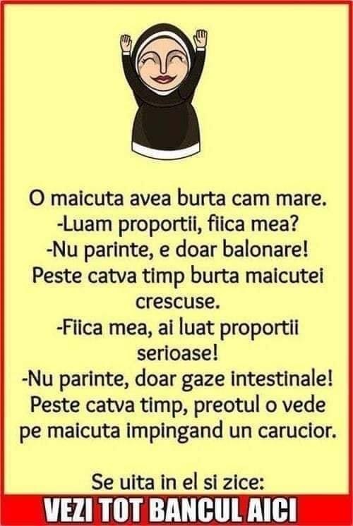 O măicuță avea burta cam mare.– Luăm proporții, fiica mea?– Nu părinte, e doar balonare!Peste câtva timp, burta măicuței crescuse.– Fiica mea, ai luat proporții serioase!– Nu părinte, doar gaze intestinale!Peste câtva timp, preotul o vede pe măicuță împingând un cărucior. Se uită în el și zice:– Simpatica bășină! Doi prieteni în vacanță. La ora … Read more