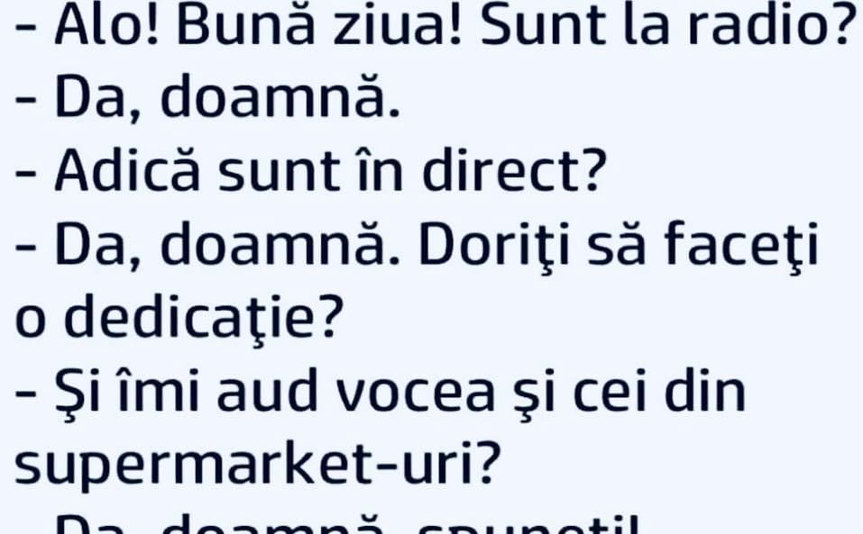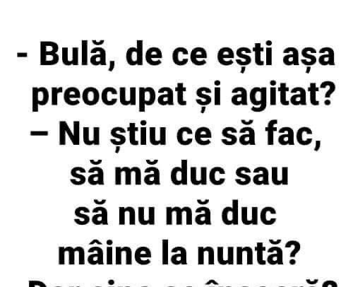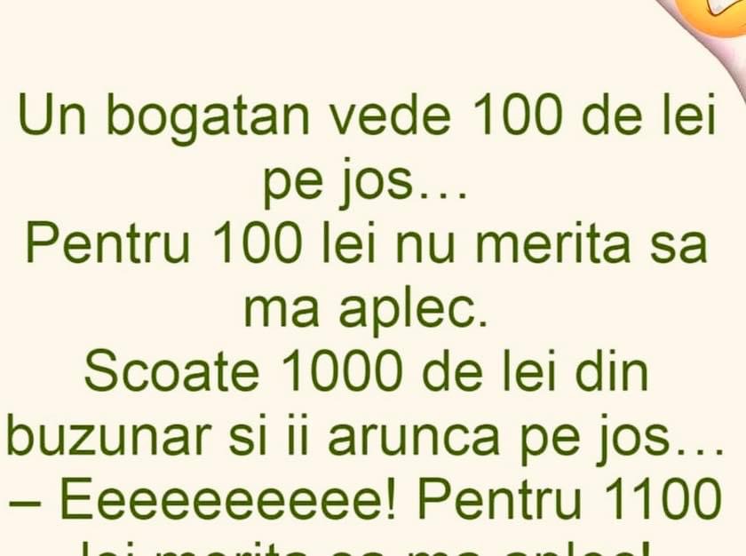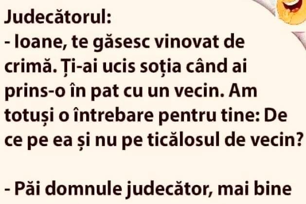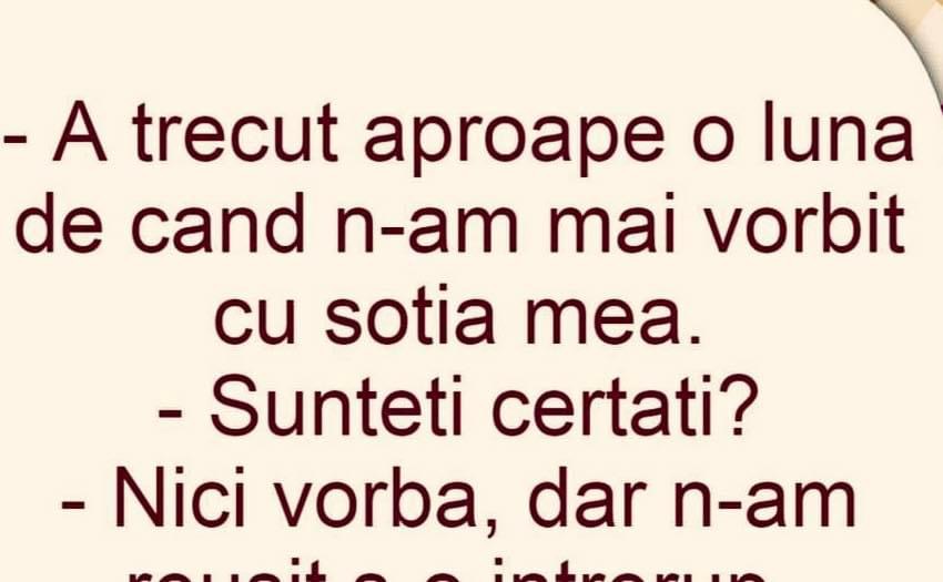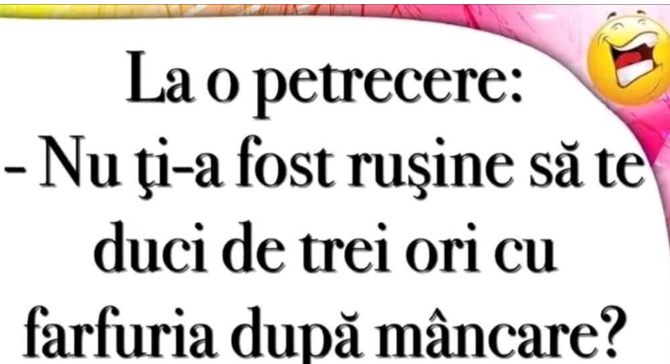 Auzi, măi Bulă, vrem să tapetăm camera de zi şi e la fel de mare ca a ta. Tu când ţi-ai tapetat câte suluri ai cumpărat? – 20.– Mulţumesc.După 2 săptămâni se întâlnesc:– Auzi, mă tâmpitule, am cumpărat 20 de suluri şi 7 mi-au rămas în plus.– Păi şi mie… Măria s-a culcat în pat … Read more