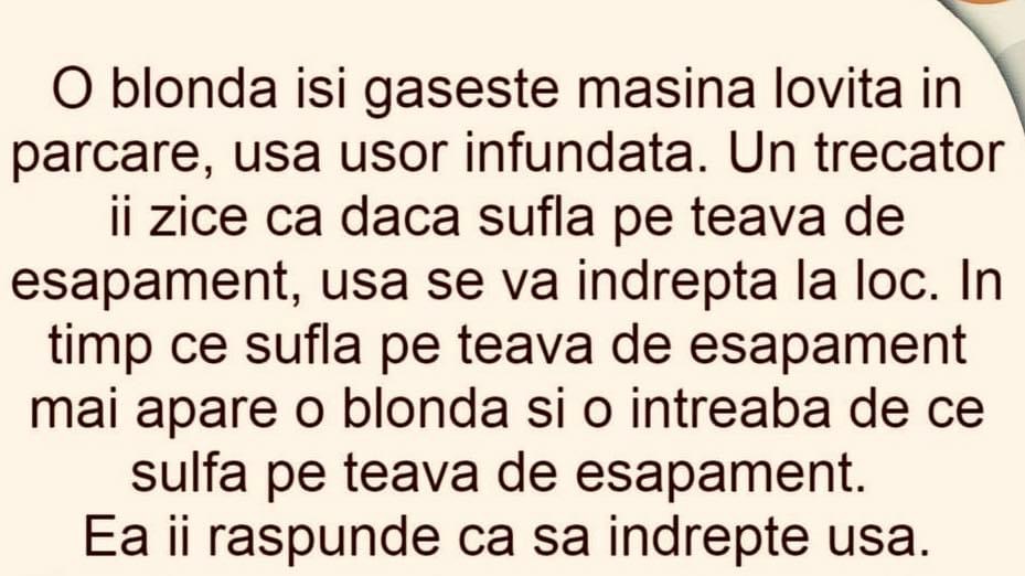 O blonda isi gaseste masina lovita..Un trecator ii zice ca daca sufla…