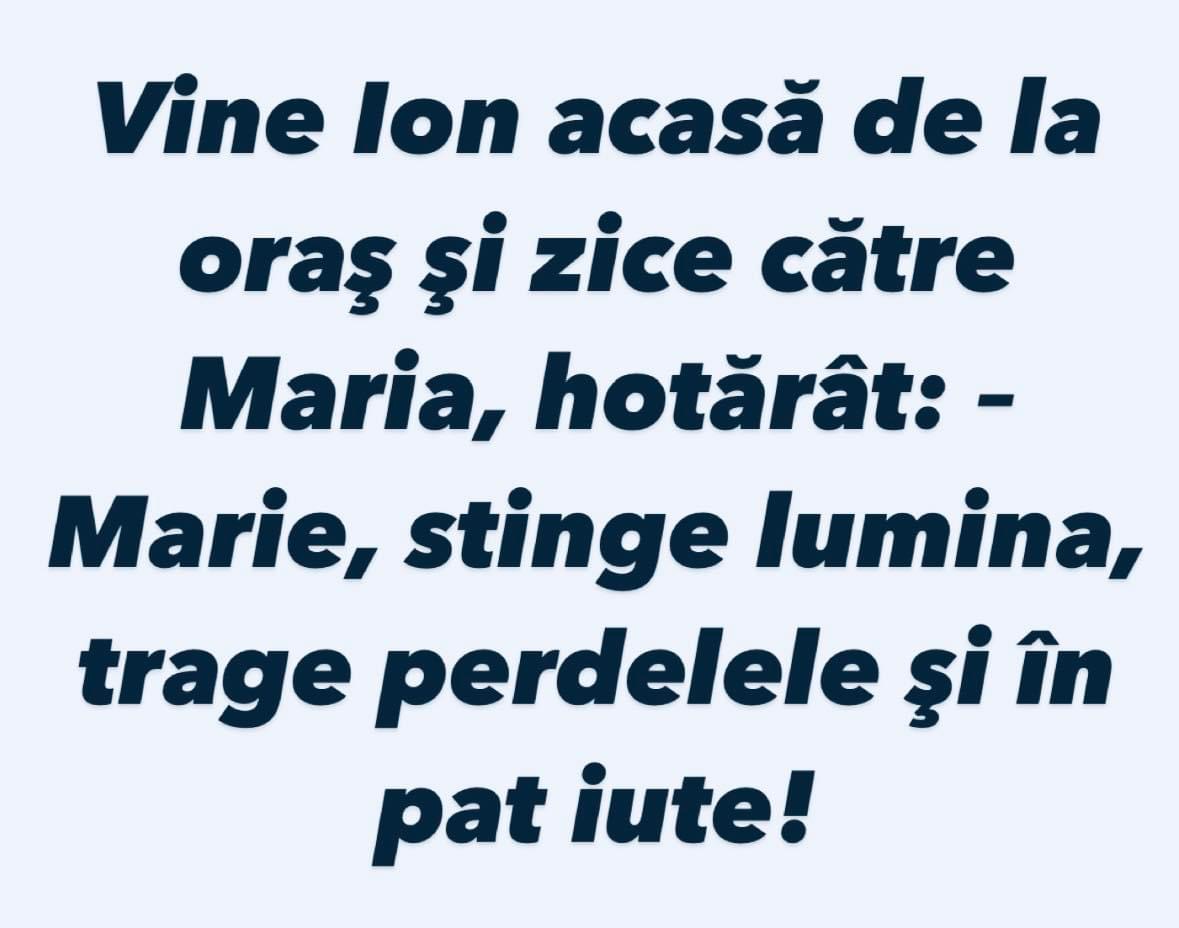 Vine Ion acasă de la oraş şi zice către Maria, hotărât: – Marie, stinge lumina, trage perdelele şi în pat iute!