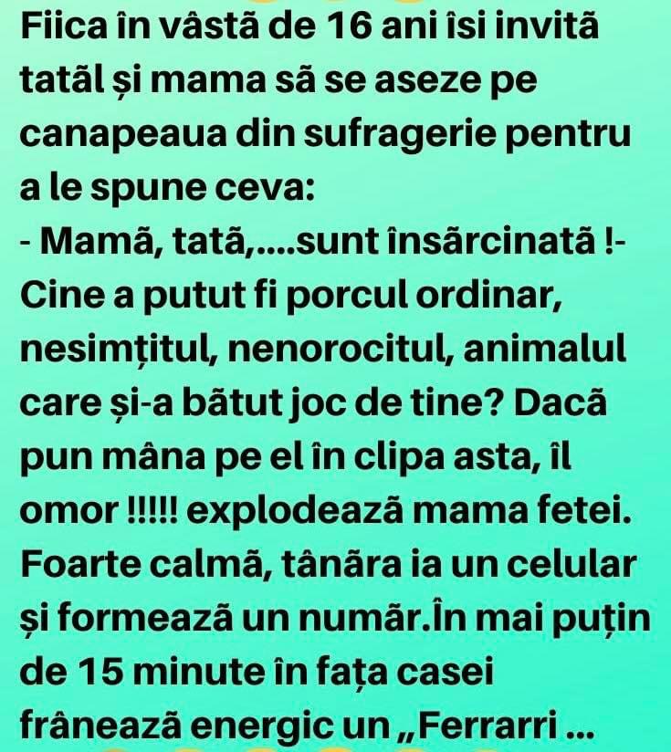 Politistul: – Bună ziua !Femeia: – Bună ziua ! Ce s-a întâmplat ?Politistul: – Ați depășit limita de viteză. Permisul dvs., vă rog.Femeia: – Vi l-aș da, numai că nu am așa ceva. L-am pierdut definitiv pentru conducere repetată în stare de ebrietate.Politistul: – Aha… Îmi arătați, vă rog, actele mașinii ?Femeia: – Nu pot. … Read more