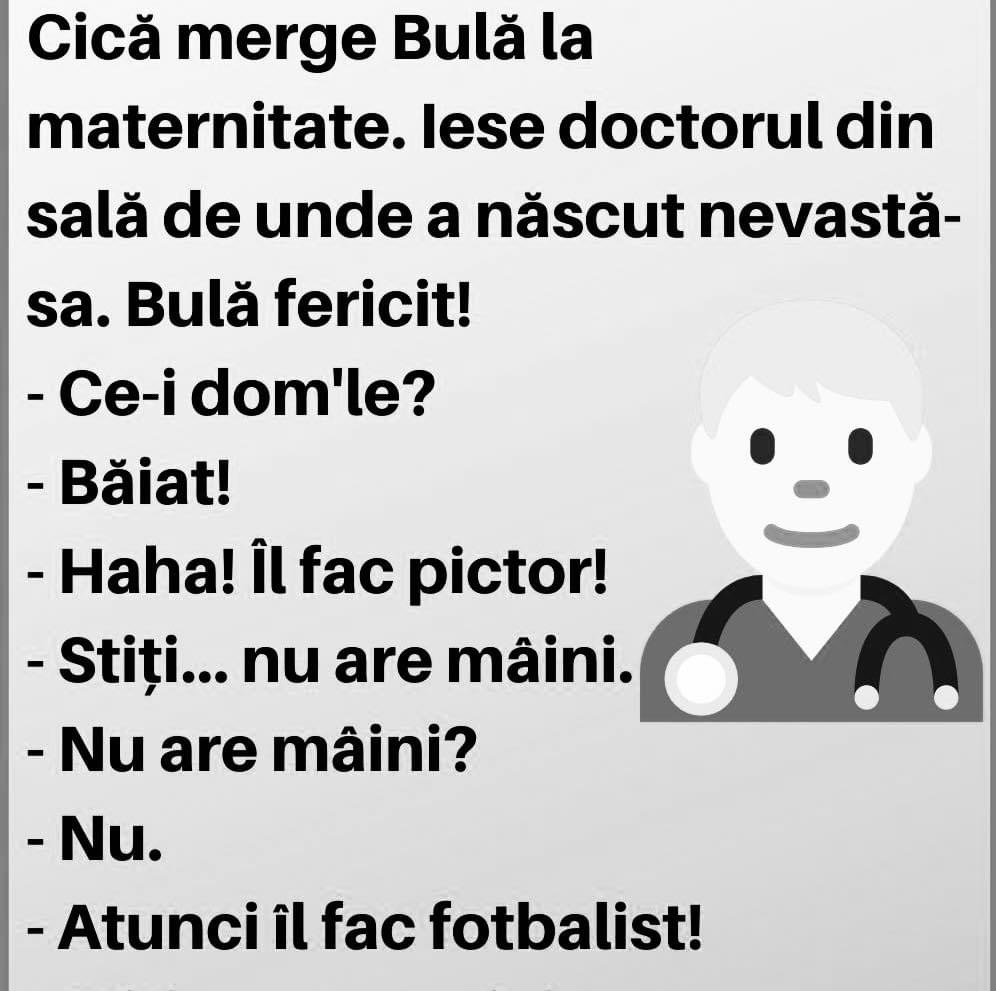 Într-un bar intra un tip foarte mulţumit:– De baut la toata lumea. Fac cinste! Mi s-a născut un fiu!– Ce greutate?– 4 kg!– Lungime?– 53 cm!– Cum se simte soţia?– Ea inca nu stie! Bula a imbatranit si a devenit om de serviciu la o intreprindere. Intr-o zi directorul il cheama si ii spune:– Vreau … Read more