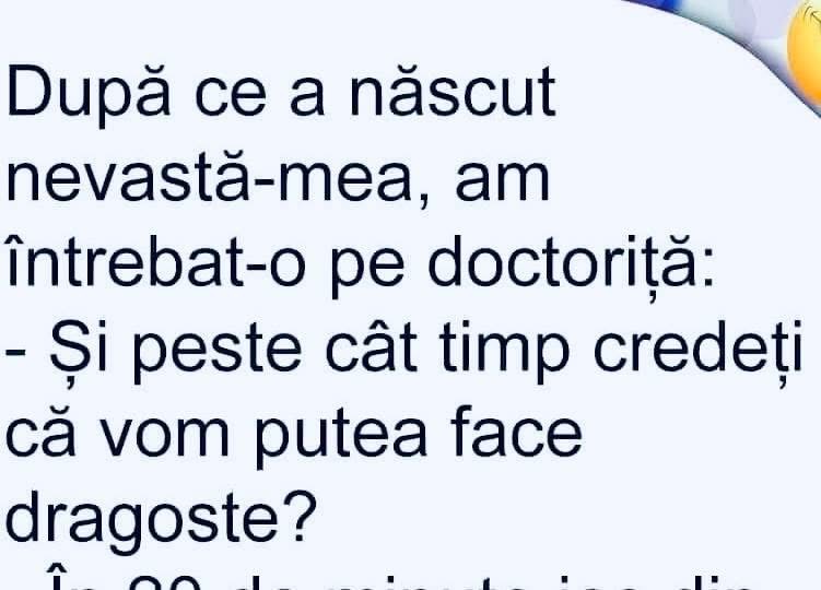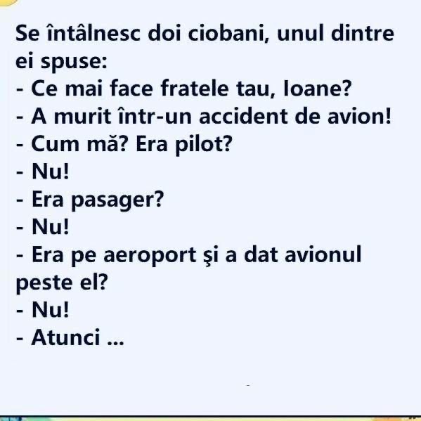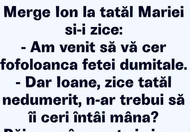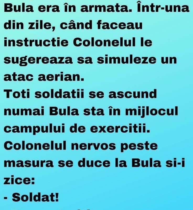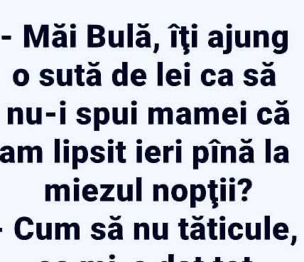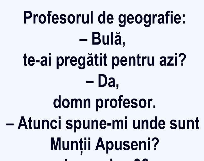 Măi Bulă, cum a fost azi la şcoală, ai luat vreo notă? îl întreabă maică-sa.– Da, zice Bulă, nota trei. Şi a zis doamna învăţătoare să vii să vorbeşti cu ea!– Iarăşi?!… Se duce maică-sa la învăţătoare:– Doamnă, de ce-i puneţi copilului meu numai note de trei?… E chiar atât de prost?! – Pai cât … Read more