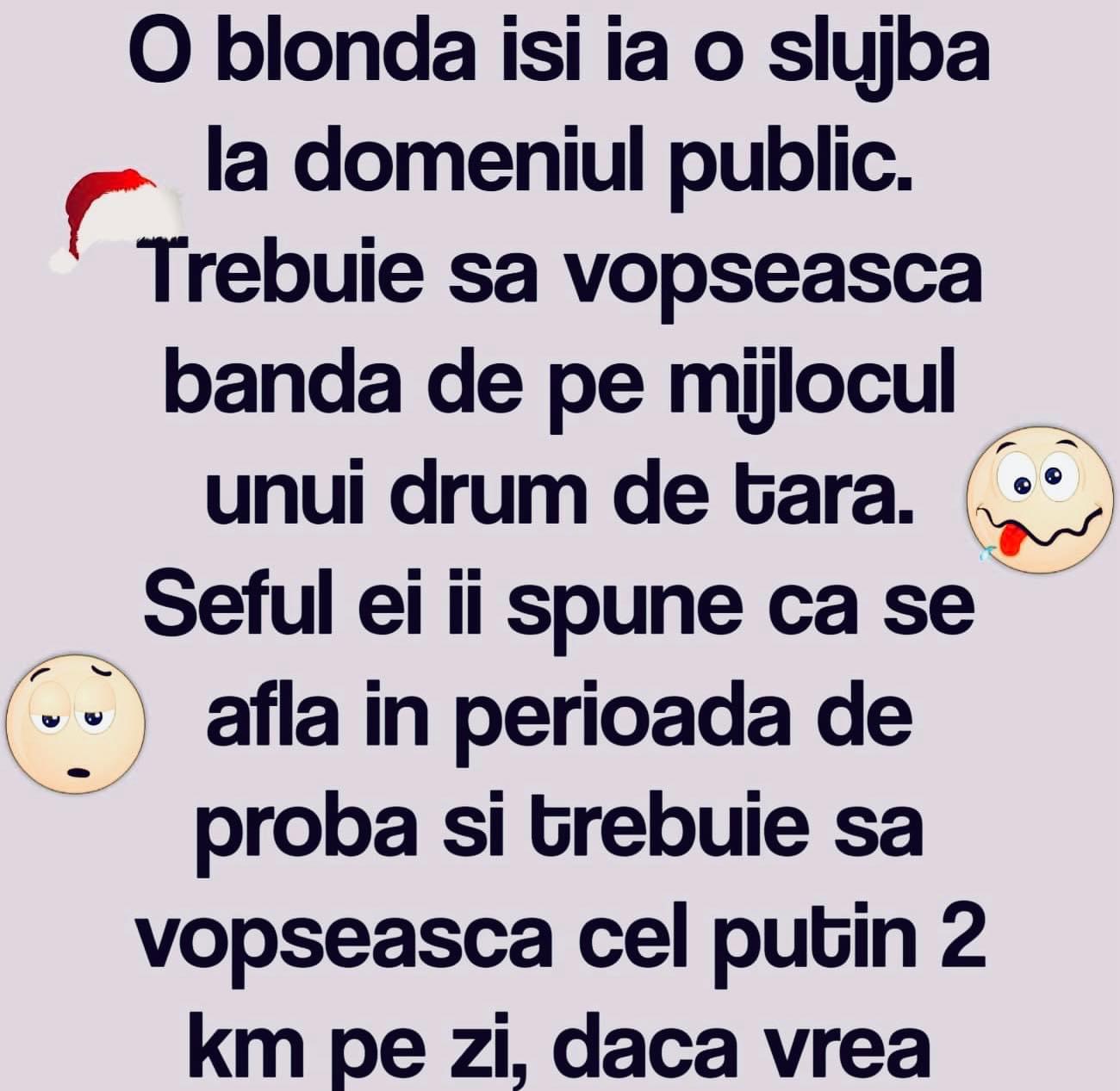 O blonda isi ia o slujba la domeniul public. Trebuie sa vopseasca banda de pe mijlocul unui drum de tara. Seful ei ii spune ca se afla in perioada de proba si trebuie sa vopseasca cel putin 2 km pe zi, daca vrea sa-si pastreze serviciul. Verificand la sfarsitul zilei, el vede ca in prima … Read more