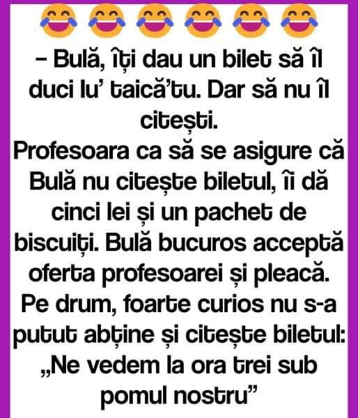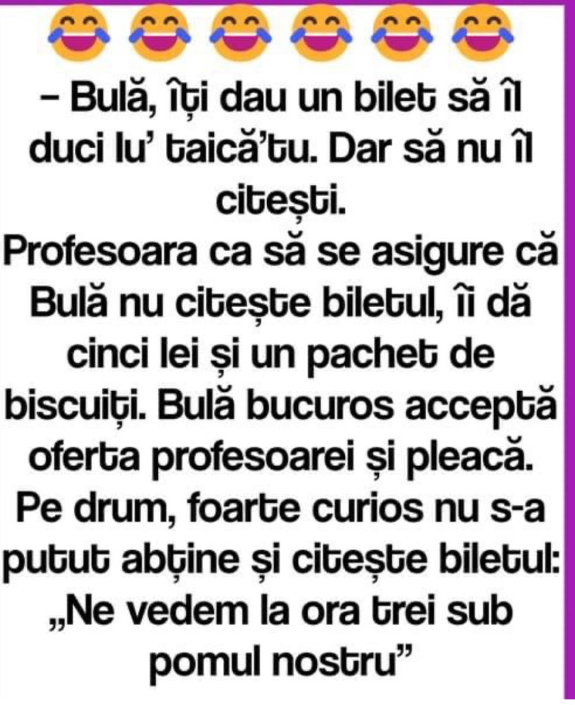 – Bulă, îți dau un bilet să îl duci Iu’ taică’tu. Dar să nu îl citești.