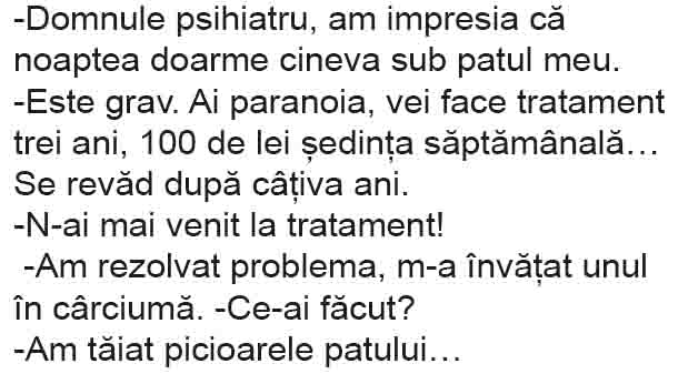 Soţia mea a fost asistenta unui magician mulţi ani. A învăţat câteva trucuri bune de la el. De exemplu, vin ieri de la muncă, intru în dormitor, ea mă vede şi strigă ABRACADABRA. Deodată, ce să vezi? Prietenul meu Răzvan a ieşit dezbrăcat din dulap. Am râs cu lacrimi, săracul Răzvan, mi-era milă de el, cred că se întreba ce dracu’ s-a întâmplat de a ajuns gol la mine-n dulap.