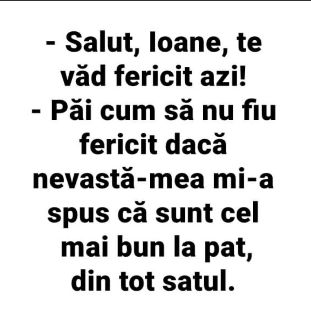 Salut Ioane te vad fericit azi !Pai cum sa nu fiu fericit daca nevasta-mea mi-a spus ca sunt cel mai …