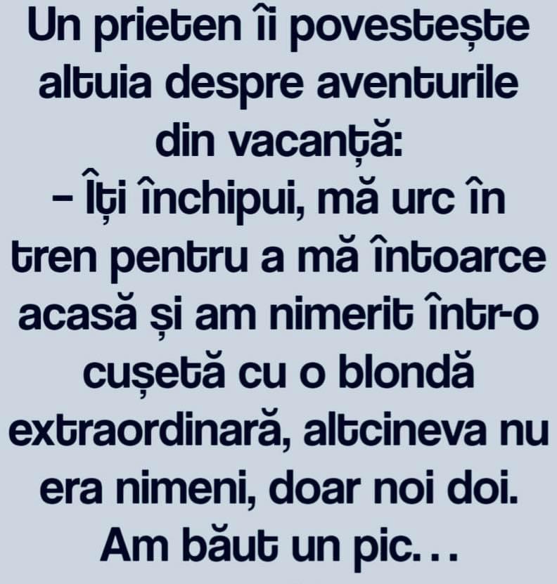 – Îți închipui, mă urc în tren pentru a mă întoarce acasă și am nimerit într-o cușetă cu o blondă extraordinară, altcineva nu era nimeni, doar noi doi. Am băut un pic…
