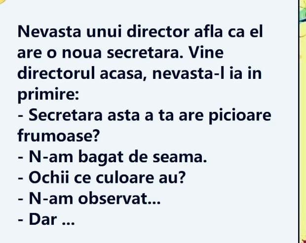 – Vai, dragă, spuse directorul în altă zi, secretara mea a venit azi cu o fustă cu numai vreo 3 cm mai scurtă decât porţi tu, dar ştii ce mult contează?! Iar nici un comentariu.