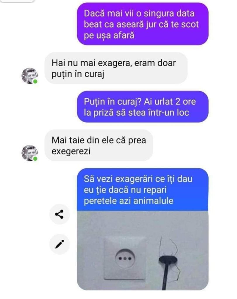 – Să vezi exagerări ce îți dau eu ție dacă nu repari peretele azi, animalule.