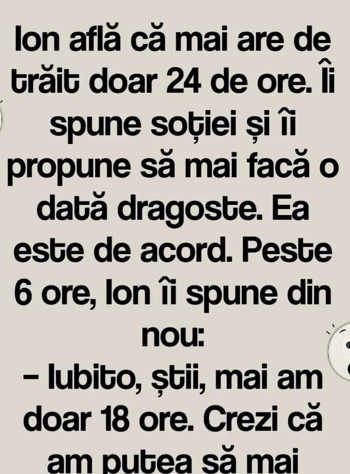 – Iubito, ştii, mai am doar 18 ore. Crezi că am putea să mai facem dragoste încă o dată?