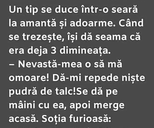 Arată mâinile! Îi zice soţia şi vede că are mâinile pline de pudră de talc.