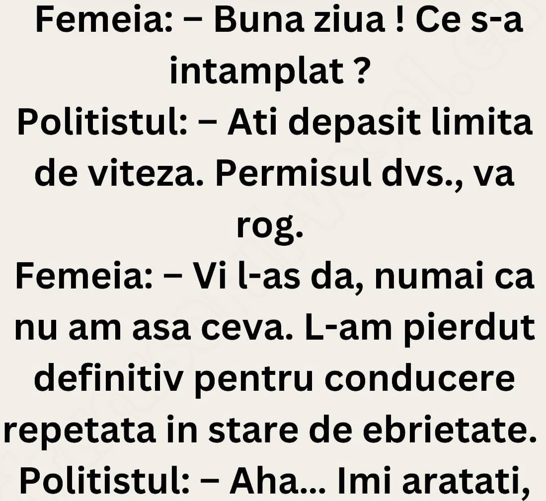 1 thought on “Politistul: – Bună ziua !Femeia: – Bună ziua ! Ce s-a întâmplat ?Politistul: – Ați depășit limita de viteză. Permisul dvs., vă rog.Femeia: – Vi l-aș da, numai că nu am așa ceva.”