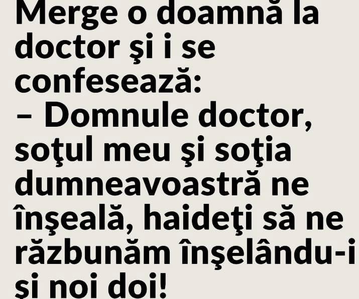 – Domnule doctor, soţul meu şi soţia dumneavoastră ne înşeală, haideţi să ne răzbunăm înşelându-i şi noi doi!