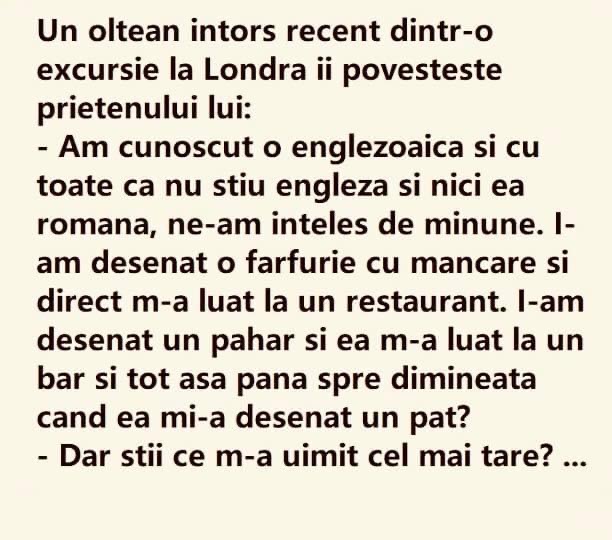 – Am cunoscut o englezoaica si cu toate ca nu stiu engleza si nici ea romana, ne-am inteles de minune.