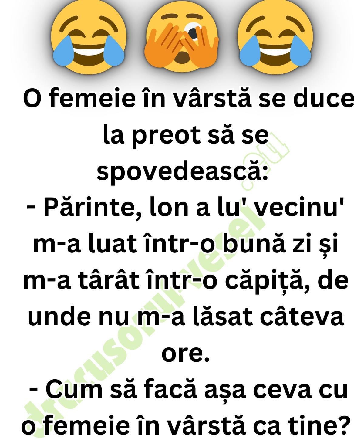 – Părinte, am venit să mă spovedesc. Acum mulți ani, Ion a lu’ vecinu’ m-a luat într-o bună zi, m-a tras într-o căpiță de fân și nu m-a lăsat să plec ore întregi…