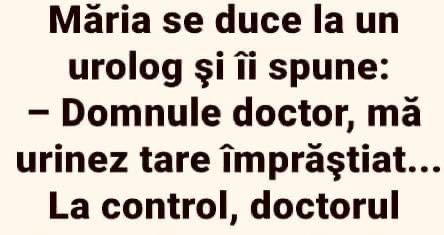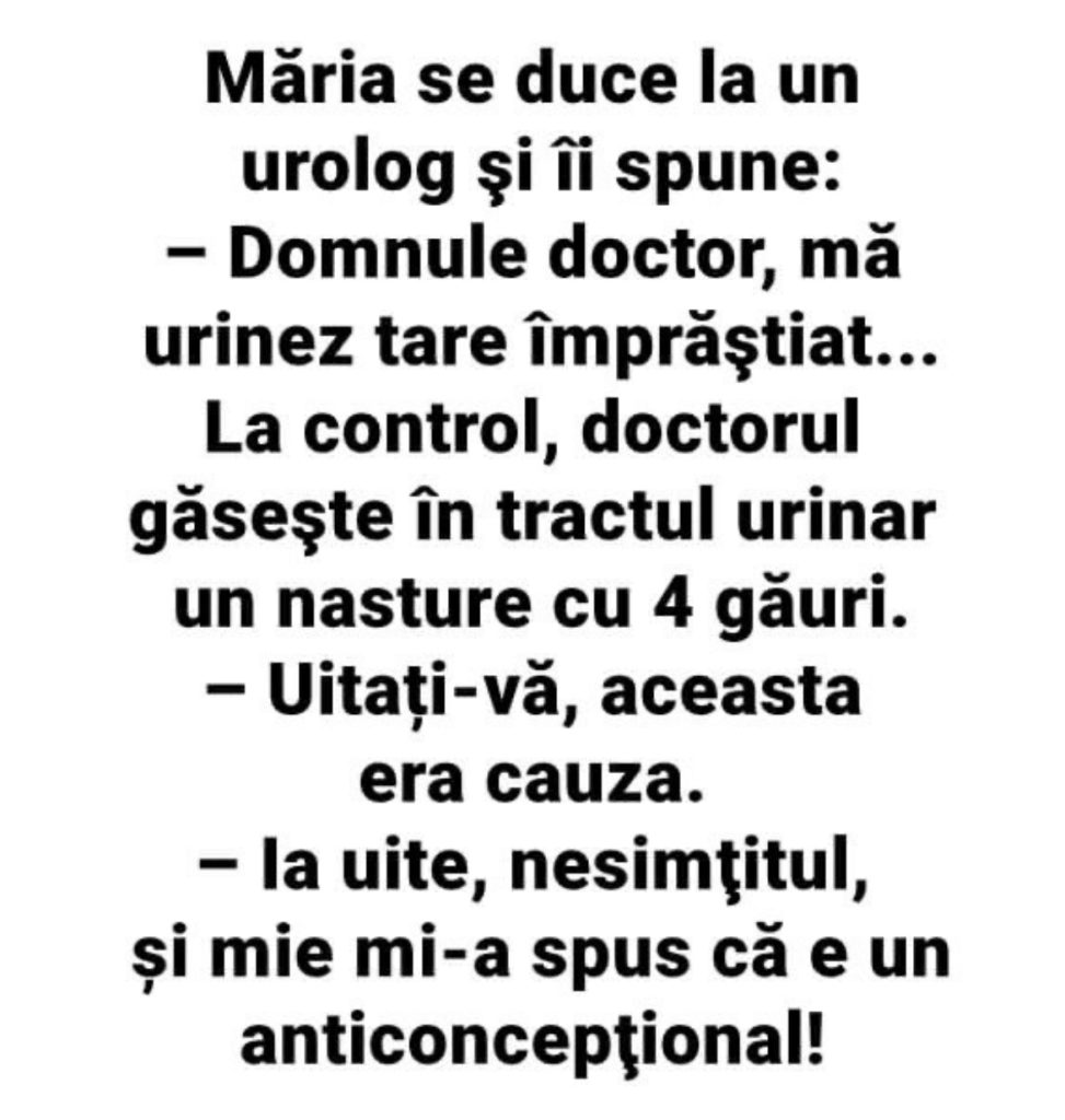 1 thought on “Marie se duce la un urolog si ii spune: Domnule doctor ma urinez tare imprastiat …La control doctorul gaseste in tractul urinar…”