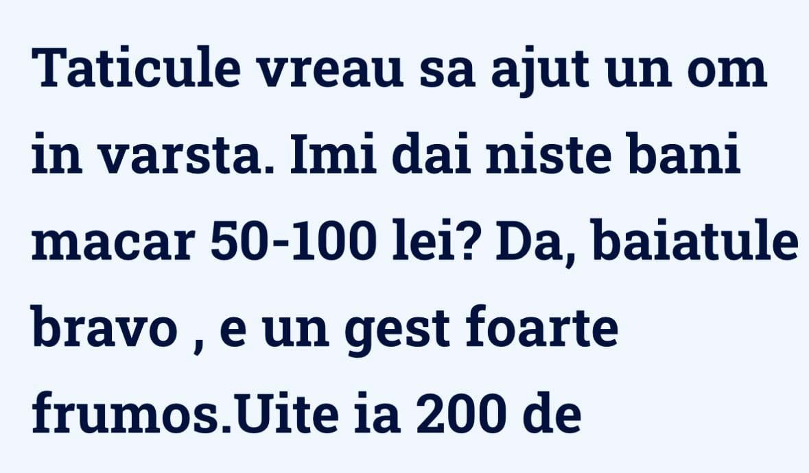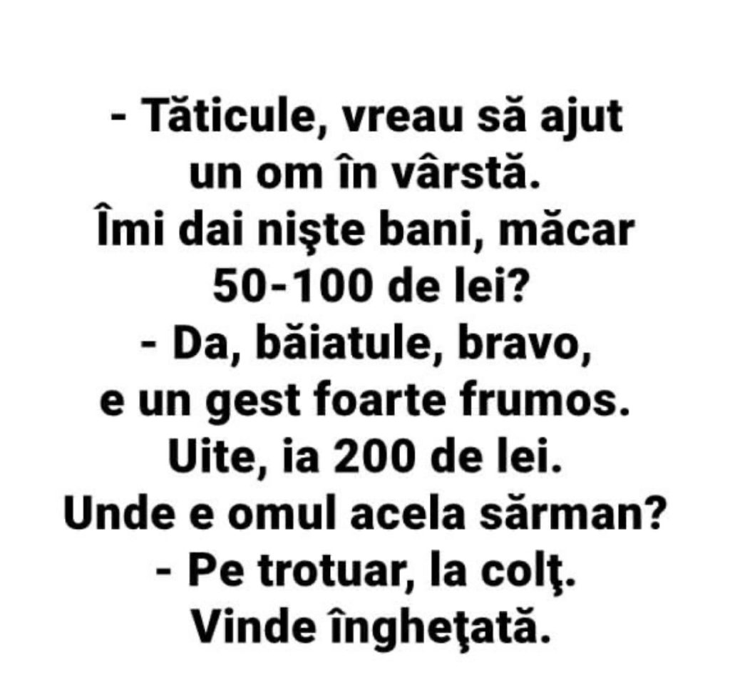 Zis şi făcut. Înre timp apare si soţul doamnei acasă să se schimbe căci avea o întâlnire importantă. Deschide sifonierul şi dă cu ochi de dulgher. La care acesta: - Dacă-ţi spun că aştept autobuzul, mă crezi?