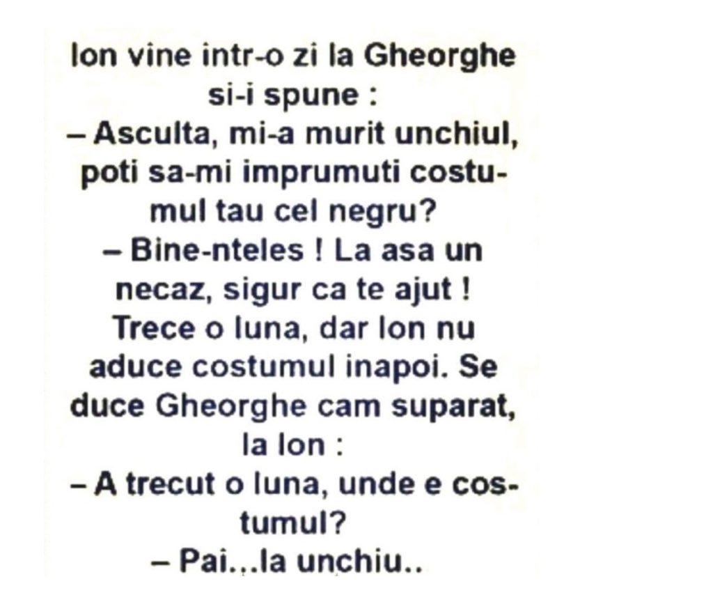 – Auzi, parinte… N-aveti cumva pe-aici vreo bicicleta, ca asa n-am nici un spor si ziua-i tare scurta…