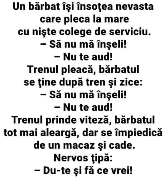 Un bărbat își însoțea nevasta care pleca la mare cu niște colege de serviciu:Trenul pleacă, bărbatul se ține după tren și zice: