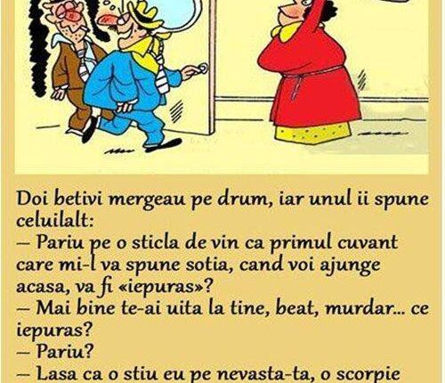 – Pariu pe o sticla de vin ca primul cuvant care mi-l va spune sotia, cand voi ajunge acasa, va fi «iepuras»?