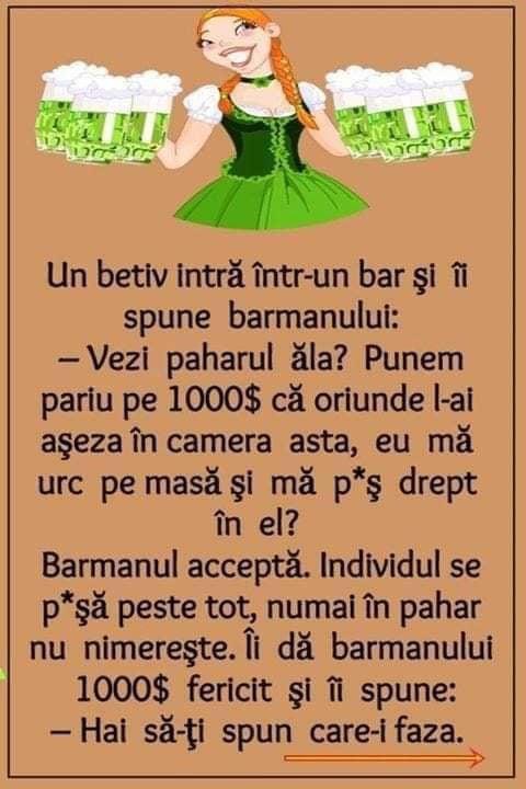 – Vezi paharul ala? Punem pariu pe 1000 de dolari ca, oriunde l-ai aseza in incaperea asta, eu ma urc pe masa si urinez drept in el?