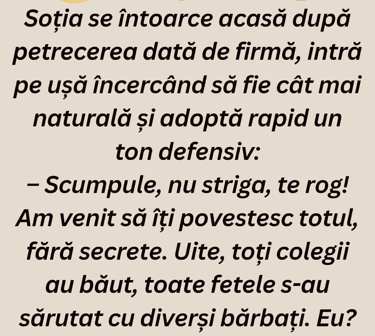 – Scumpule, nu striga, te rog! Am venit să îți povestesc totul, fără secrete. Uite, toți colegii au băut, toate fetele s-au sărutat cu diverși bărbați. Eu? Eu n-am făcut nimic! M-am ținut departe, am mâncat doar salate, am dansat puțin, am participat la concursuri și cam asta a fost. Ai o soție model! Întrebări sunt?