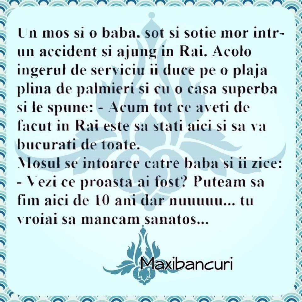 – Eu? Sunt chiar în spatele tău, la supermarket, îi spune vecinul, chicotind. Voiam doar să te întreb dacă vrei să te ajut cu sacul ăla de cartofi până acasă…
