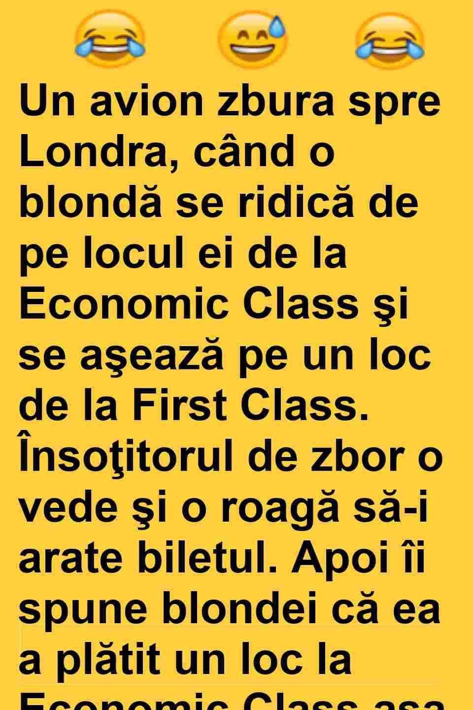 Însoţitorul intră în cabina piloţilor şi le spune de bomba blondă care nu vrea să stea pe locul plătit, ci stă la First Class.