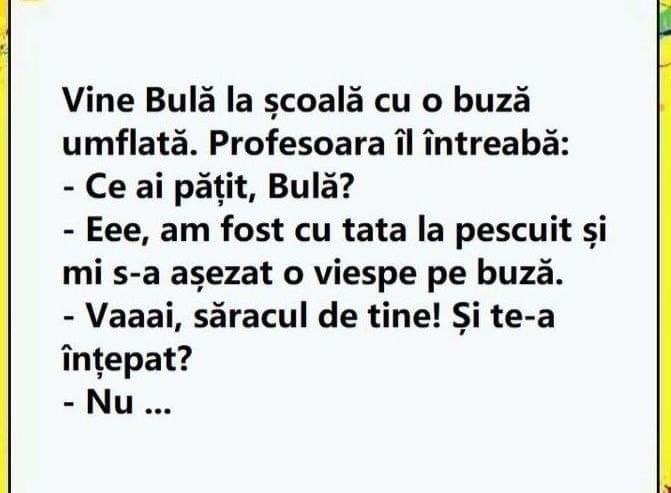 Vine Bulă la școală cu o buză umflată. Profesoara îl întreabă: