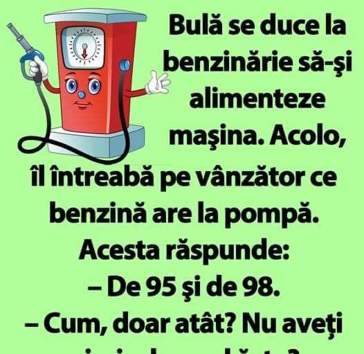 Bulă se duce la benzinărie să-şi alimenteze maşina. Acolo, îl întreabă pe vânzător ce benzină are la pompă. Acesta răspunde: