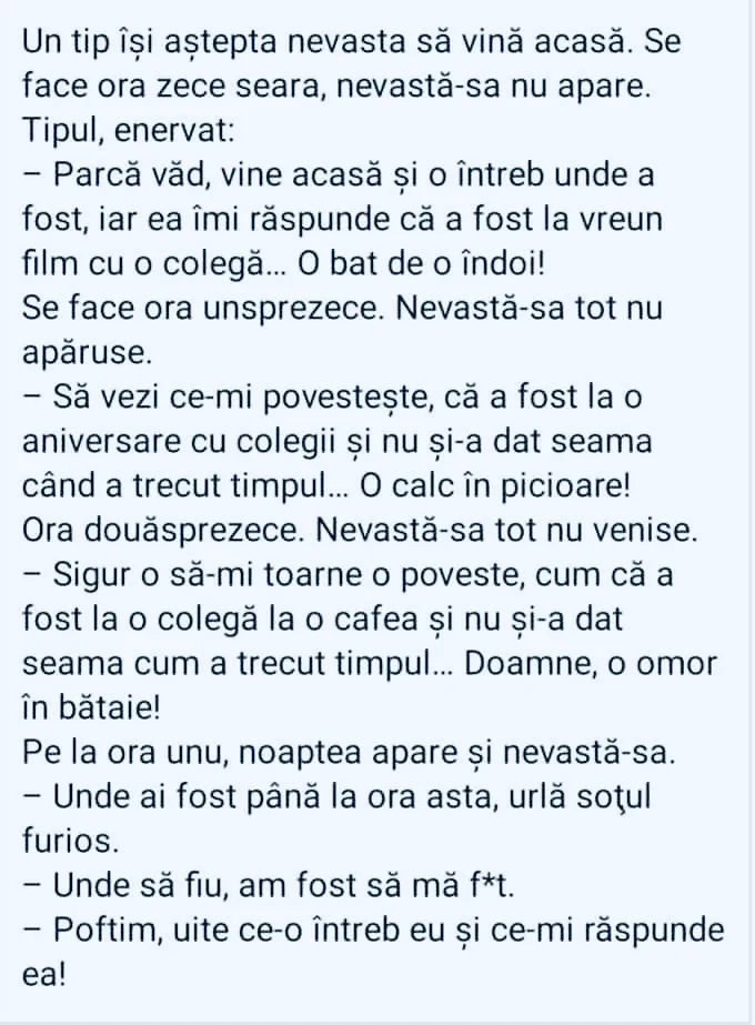 Sotul cu o voce calda si întelegatoare, cum o au toti barbatii ce sunt însurati, spune: