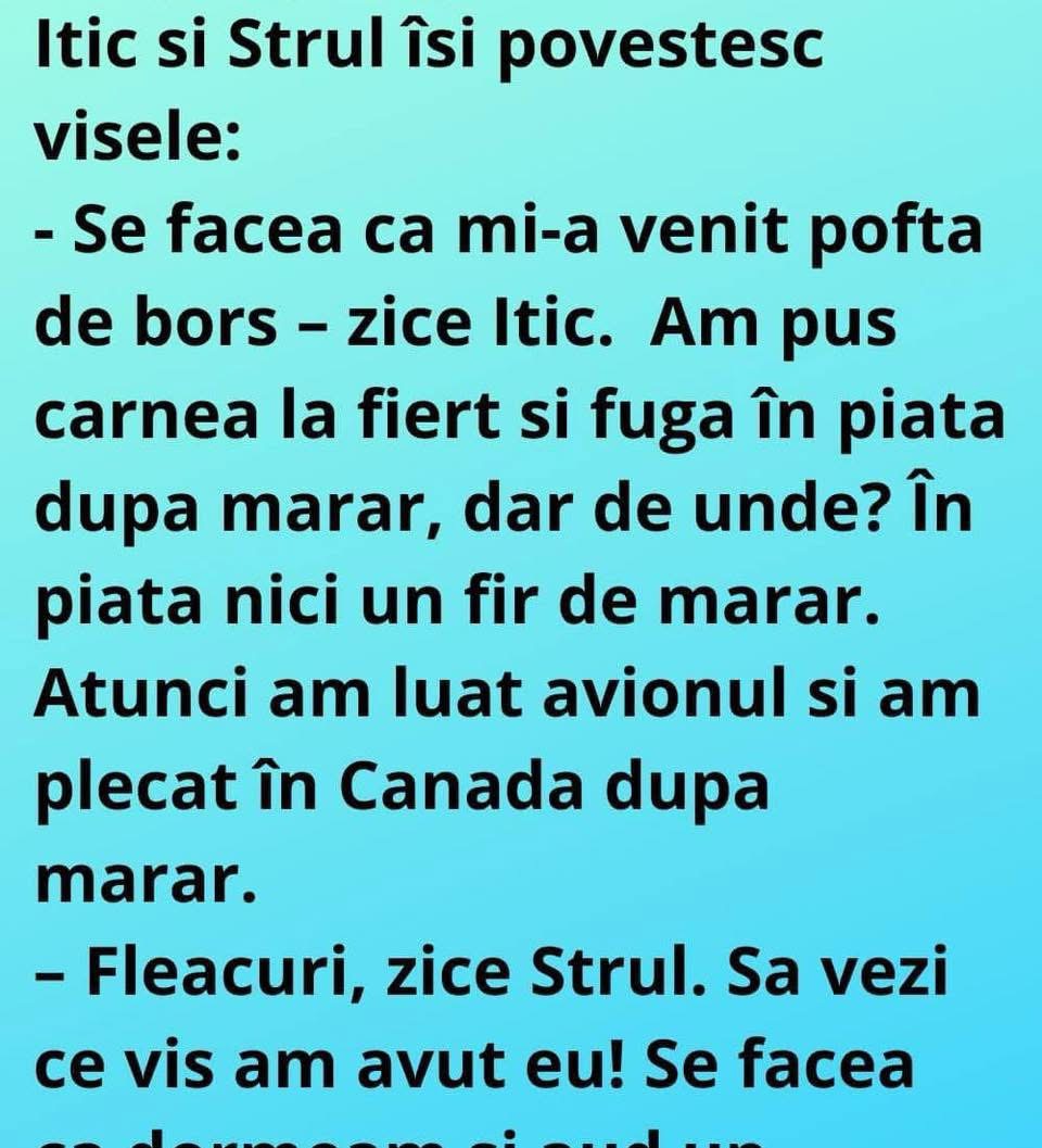 – Se facea ca mi-a venit pofta de bors – zice Itic. Am pus carnea la fiert si fuga în piata dupa marar, dar de unde? În piata nici un fir de marar.