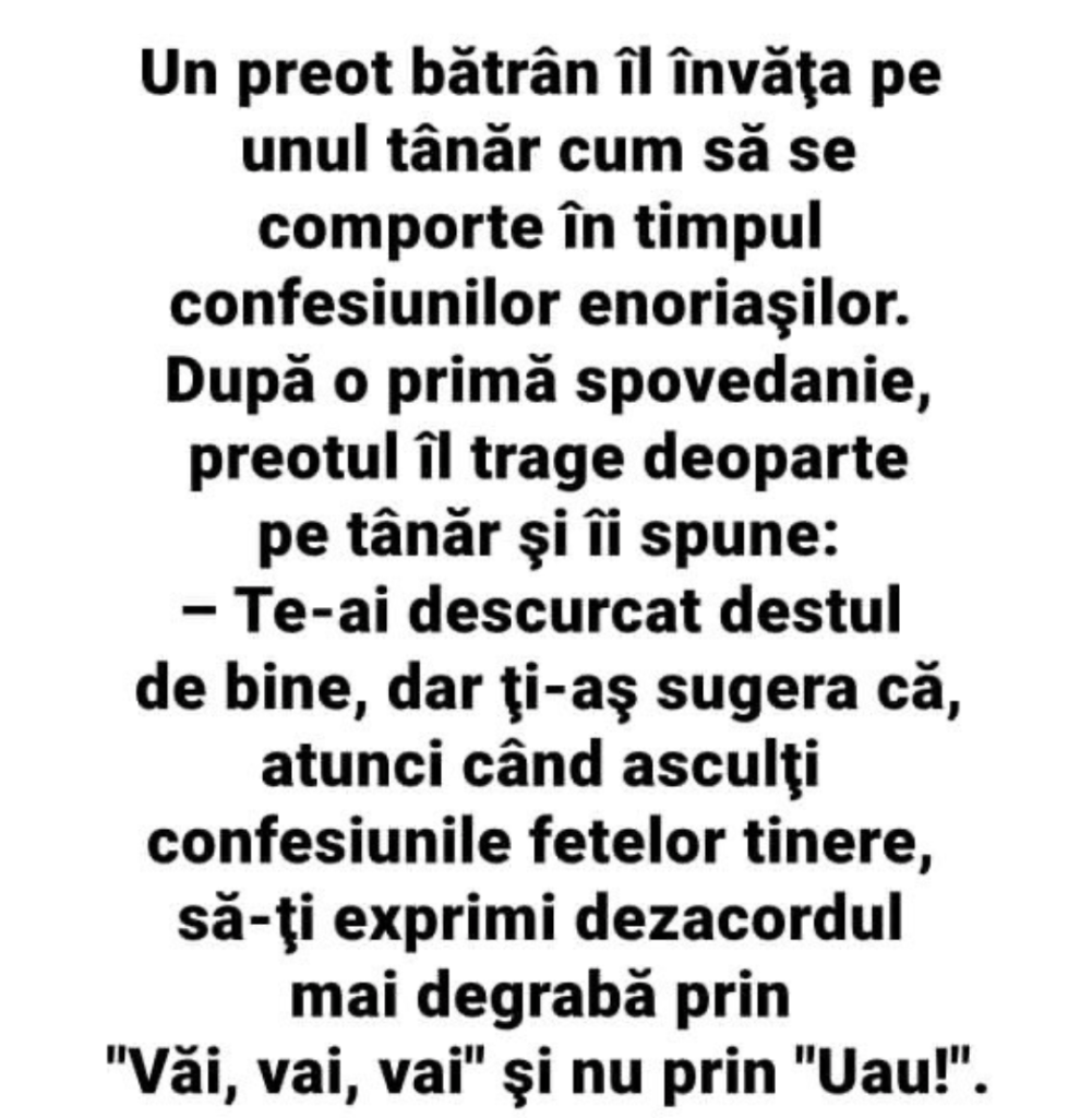 Negrul, cam uimit, se executa, dupa care il intreaba pe doctor ce legatura are treaba asta cu durerile lui de gat.La care doctorul raspunde:– Nu, n-are nici o legatura, dar mi-am cumparat o masa neagra pentru sufragerie si ma gandeam unde sa o pun.Un inspector vine la o casa de nebuni si le da acestora un test:– Cat face 7+7?Un nebun raspunde:– 1782!– NU!