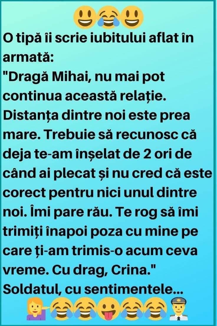 ”Dragă Mihai, nu mai pot continua această relație.Distanța dintre noi este prea mare.