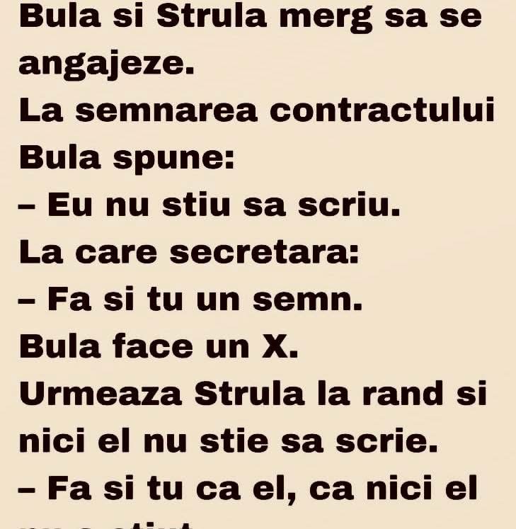 Bula si Strula merg sa se angajeze. La semnarea contractului Bula spune: