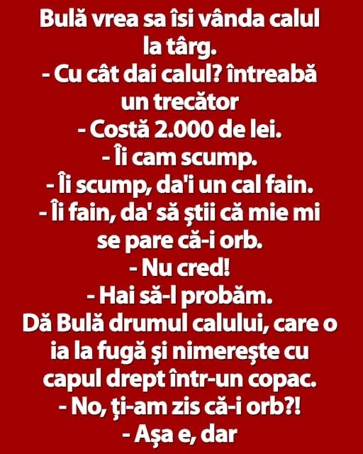Dă Bulă drumul calului, care o ia la fugă și nimerește cu capul drept într-un copac.