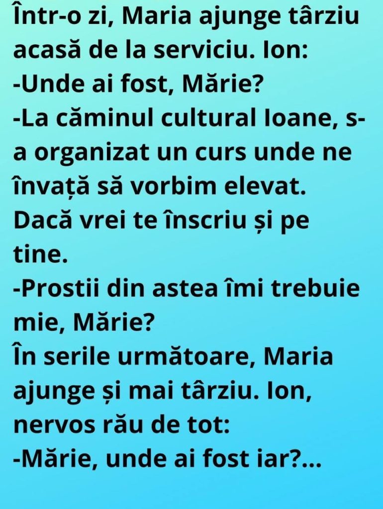 -Nu ți-am spus, Ioane, la curs la căminul cultural… Învățăm să vorbim elevat.