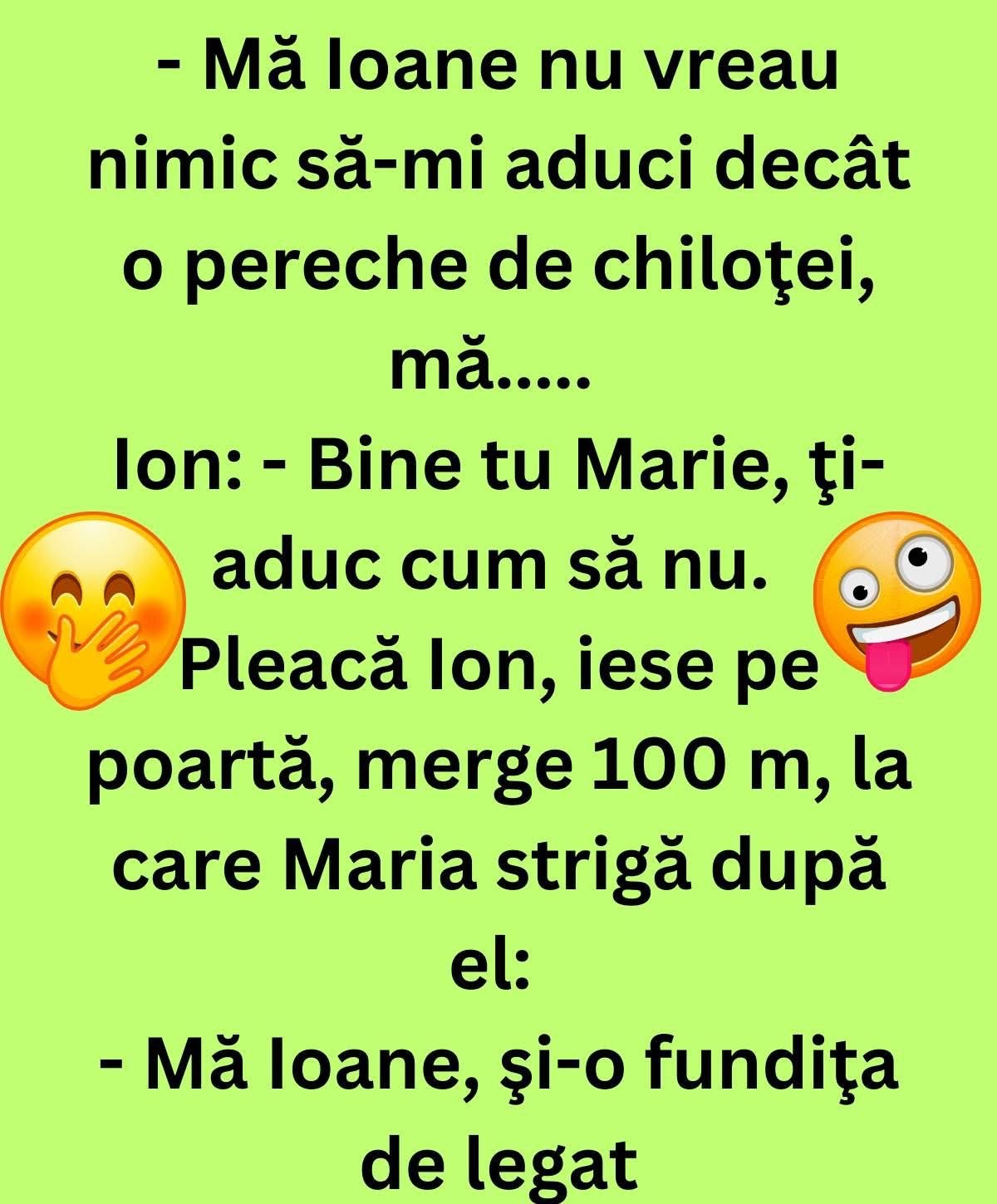 – Mă, Ioane, mă! Și-o fundiță de legat părul, să nu uiți, mă!