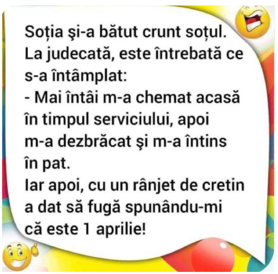 Stă el cât stă și hop vine vecinul și împreună cu soția se bagă în pat, iar ea îi zice: