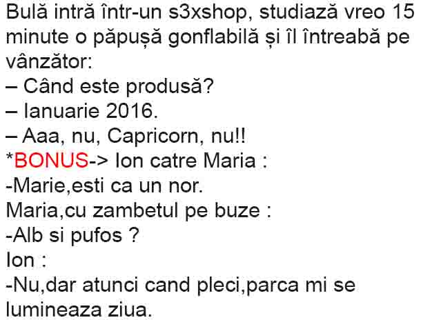 Un tip bagă capul pe ușa frizeriei și îl întreabă pe frizer cât timp trebuie să aștepte până să fie și el tuns…………Fiind o zi aglomerată, frizerul se uită în jur și răspunde: