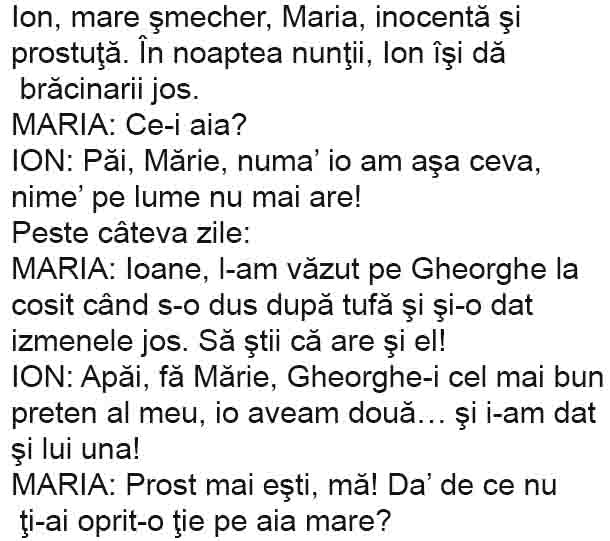 Profesoara lui Bula a scris lectia la tabla dupa care s-a dus la catedra. Cand s-a asezat, scaunul s-a rupt si aceasta a cazut cu picioarele in sus…Jenata si nervoasa in acelasi timp, aceasta incepe sa-i ia pe elevi la intrebari:– Dorel, ce ai vazut?– V-am vazut pulpa piciorului, doamna…– Suspendat pentru o saptamana! zice profa.– Gigel, tu ce ai vazut?– V-am vazut coapsa, doamna…– Iesi afara! O luna de suspendare!– Bula, tu ce ai vazut?La care acesta se ridica din banca si pleca spre usa spunand:– Bafta baieti! Ne vedem la anu’!!!