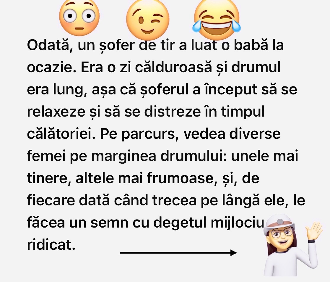 Odată, un șofer de tir a luat o babă la ocazie. Era o zi călduroasă și drumul era lung, așa că șoferul a început să se relaxeze și să se distreze în timpul călătoriei. Pe parcurs, vedea diverse femei pe marginea drumului: unele mai tinere, altele mai frumoase, și, de fiecare dată când trecea pe lângă ele, le făcea un semn cu degetul mijlociu ridicat.