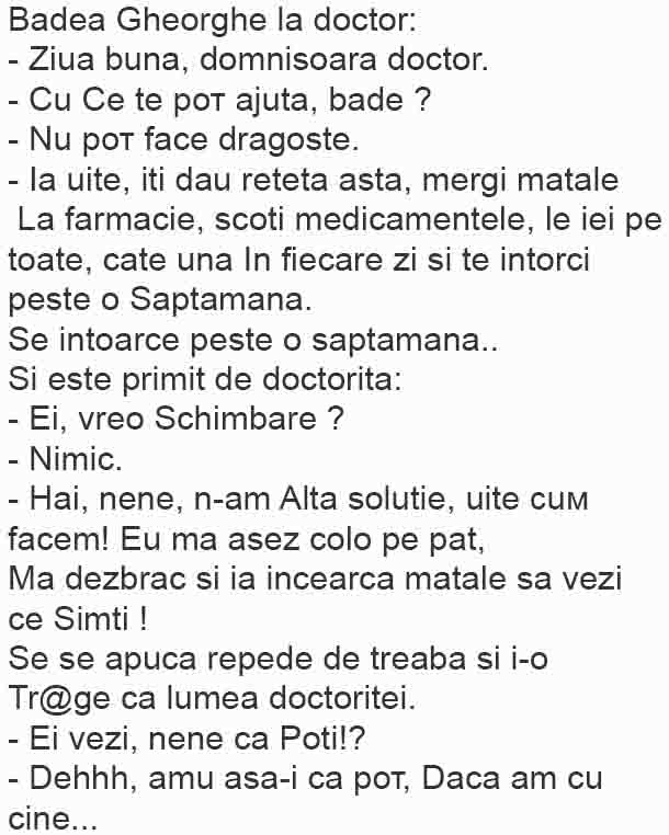 – Auzi tu, domnul zice ca prezervativul XXL ii e mic. Ce sa-i dam?